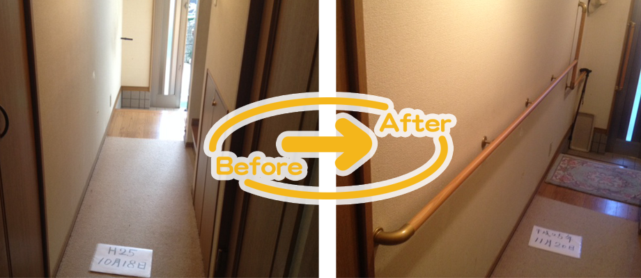 ご自宅で転倒の危険性のある場所(玄関、トイレ、浴室、階段など・・・)に手すりを取り付ける事で、安全に移動ができます。